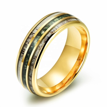 Gentdes Đồ Trang Sức 8Mm Dome 18K Vàng Vàng Tungsten Ban Nhạc Inlay Deer Hươu Và Moss Agate Engagement Wedding Nhẫn